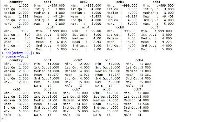 R does not like missing data. We will need to define which values are missing. I previously coded all missing data as -999 in SPSS or EXCEl. Now I have to declare that these annoying -999s should be treated as missing values.